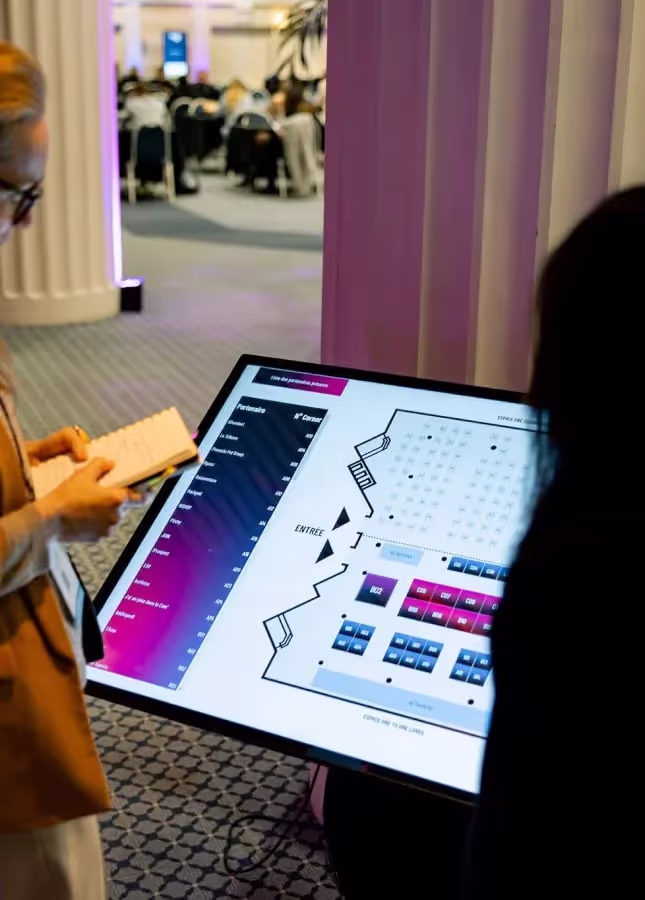 With interactive screens and applications incorporating geolocation, visitors can easily locate booths, conferences, and available services. These often personalized digital signage solutions ensure optimal navigation within the trade show.