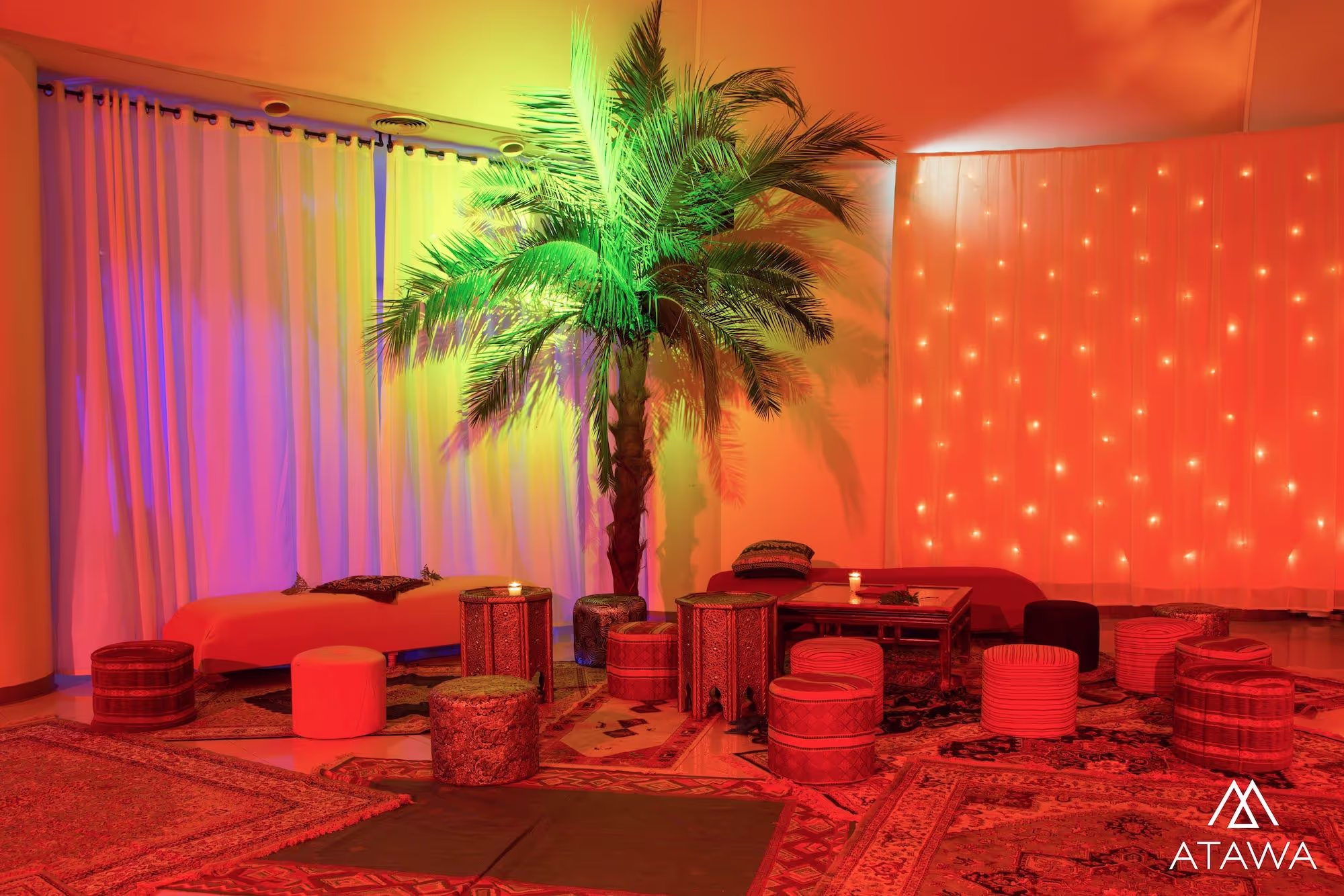 Professional event with an oriental theme. Designing an interior space using event decoration Immerse yourself in the heart of the event by viewing the virtual tour On January 12, the winter cold invaded the capital. The PSG Works Council wanted to warm up its guests for an evening. Atawa, appointed travel guide, took them to the Orient... A wind from the Orient blew in this privileged corner, in the middle of January. The Anglo-Norman manor was then transformed for an evening. The Atawa team of decorators converted the reception room into a sublime oriental palace.