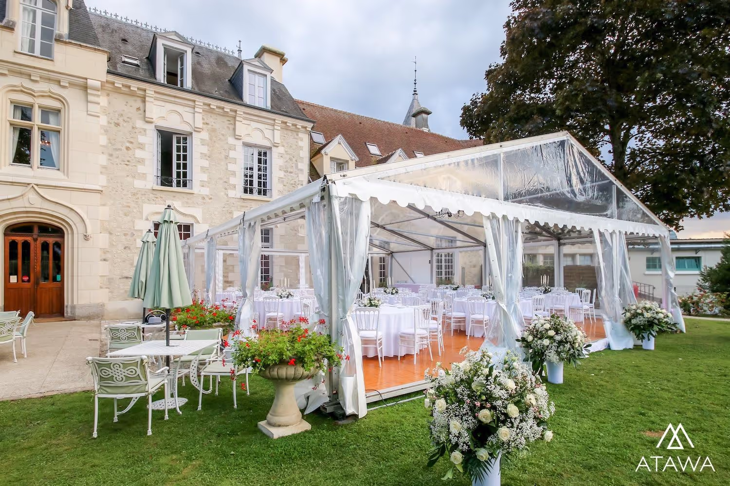 Atawa adapted to offer a tailor-made 5-star wedding. A 120m² Cristal tent was attached to the castle as a natural extension of the hotel. The floor under the canvas was raised by 30 cm so that you could walk from the tent to the castle without stumbling. The crystal canvas of the tent made it possible to enjoy a 360° view of the fortress, its residence and its forests.